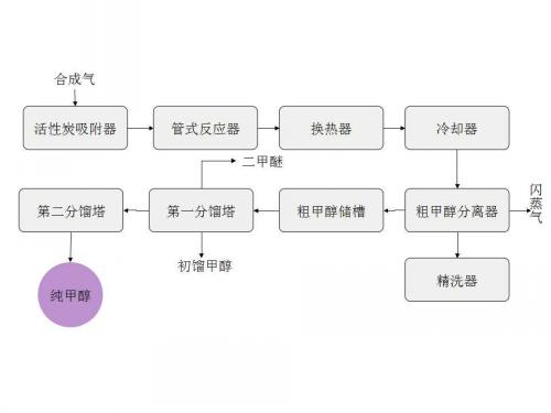 合成氣經(jīng)活性炭吸附器后進(jìn)入管式反應(yīng)器中,反應(yīng)生成粗甲醇。含粗甲醇的氣體經(jīng)冷卻器冷卻后,迅速進(jìn)入粗甲醇分離器中,使粗甲醇冷凝。冷凝的粗甲醇進(jìn)入精餾裝置,在第.一分餾塔中分出二甲醚和甲酸甲酯及其它低沸點(diǎn)不純物,在第二分餾塔里除去水和雜醇,得到精甲醇。